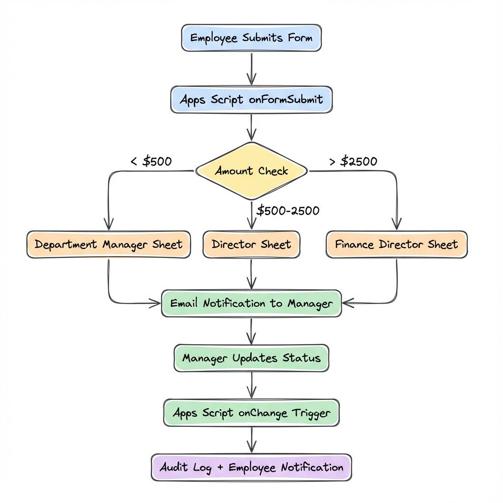 When someone submits a Google Form, Apps Script fires a trigger. Your script grabs the submission, logs it to Sheets, and emails the manager with approve/reject links. Manager clicks a link, the script updates the sheet, employee gets notified. Done.